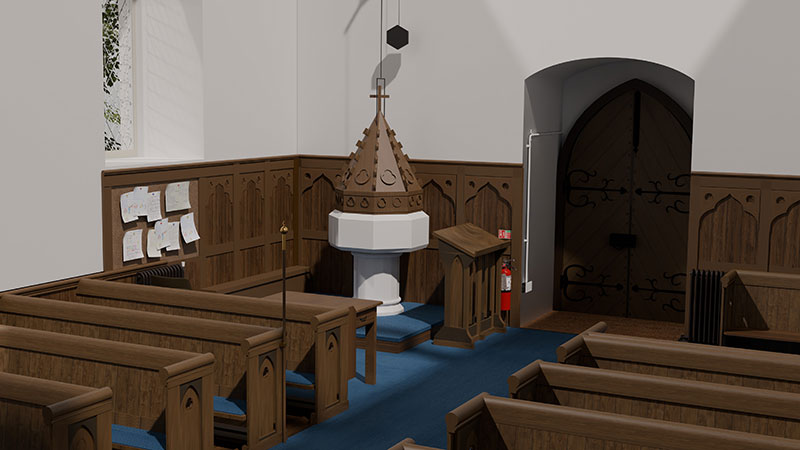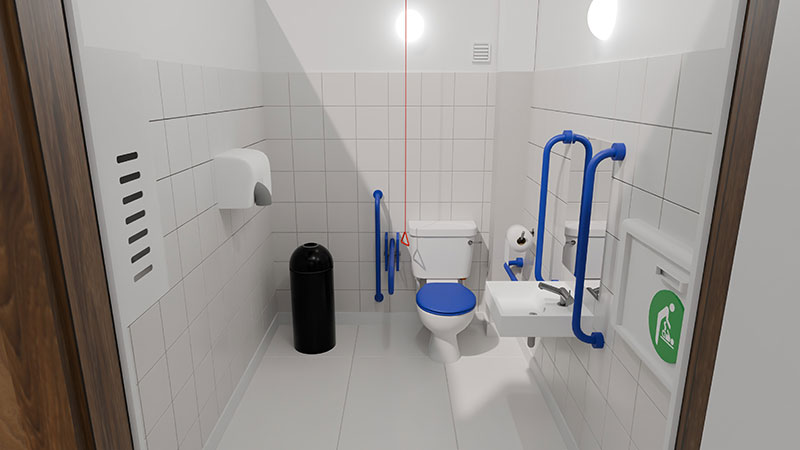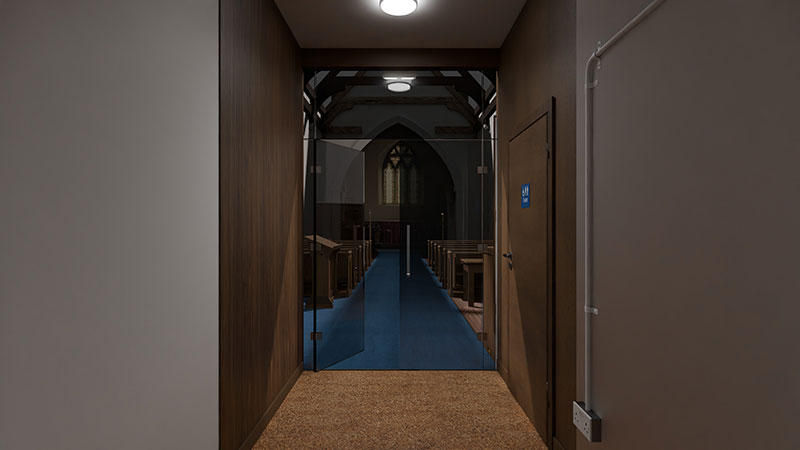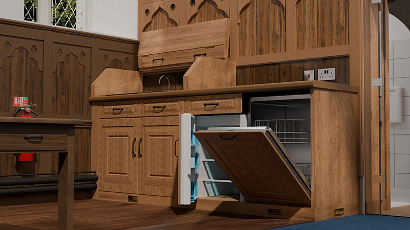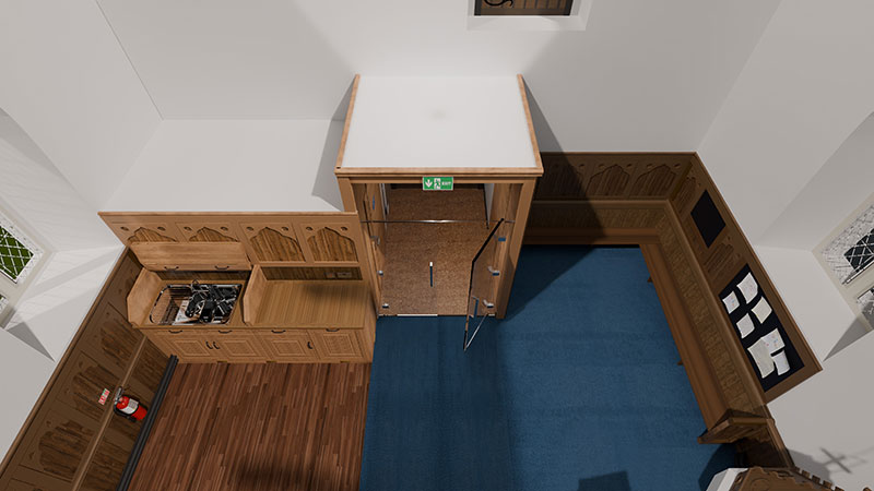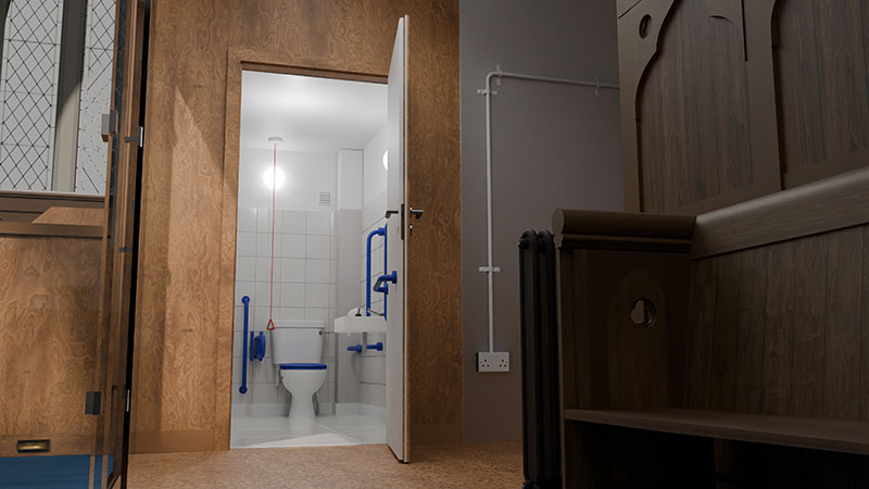 I created before and after 3D visualisations from plans for a new accessible toilet facilities and kitchen servery for a local church.